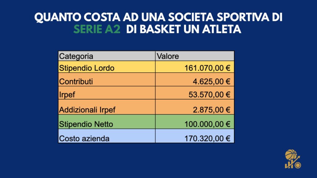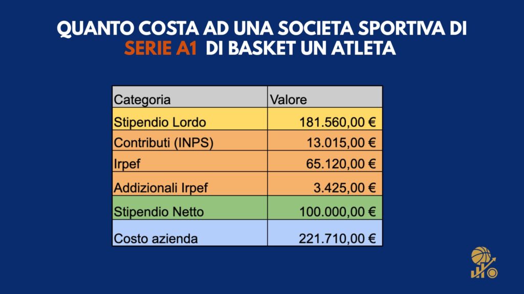 Il lato buffo — o tragicomico, dipende da come la si guarda — è che quando la palla entra nel canestro tutti applaudono, ma pochi realizzano chi sta davvero pagando il conto. Dietro ogni tiro segnato c’è una contabilità che non perdona, un tabellone che non mostra i punti ma le trattenute fiscali, i contributi e gli oneri che trasformano uno stipendio di 100.000 euro netti in una montagna di costi per la società.