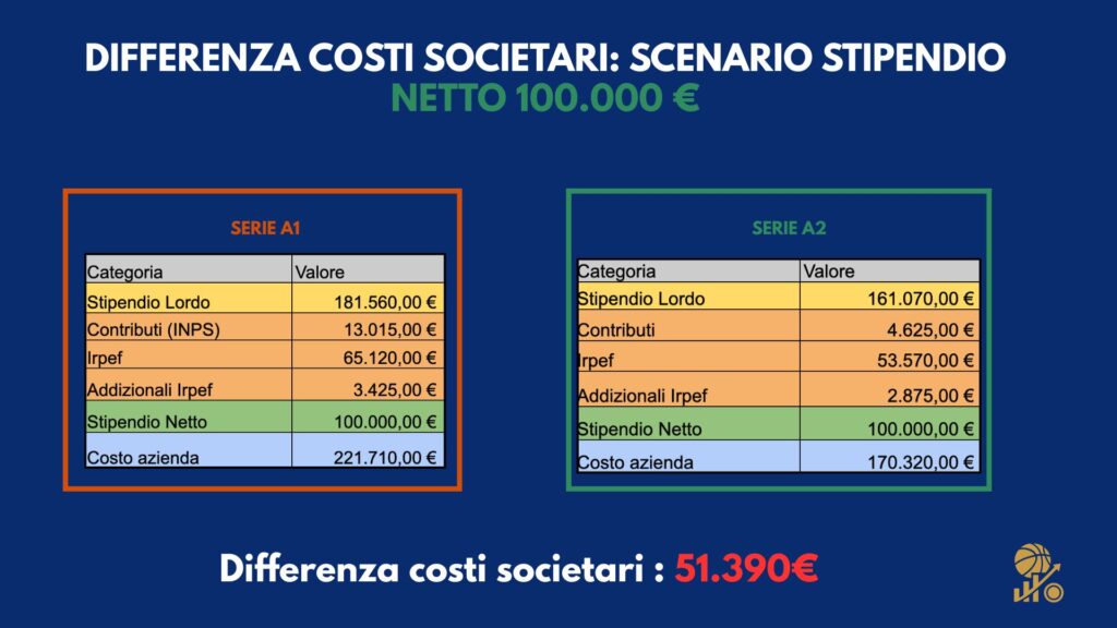 un club di A1 paga molto di più per lo stesso risultato finale. Un giocatore da 100.000 euro netti in A1 “vale” per la società più del 30% in più rispetto allo stesso giocatore in A2.