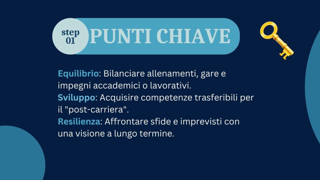 Sviluppo. Ogni allenamento costruisce il fisico, ma sono le competenze trasferibili – dal problem solving al public speaking, dalla gestione del tempo alla leadership – che costruiscono il futuro. L’atleta che investe nella sua formazione diventa un professionista completo, pronto ad affrontare il mondo del lavoro con strumenti concreti.