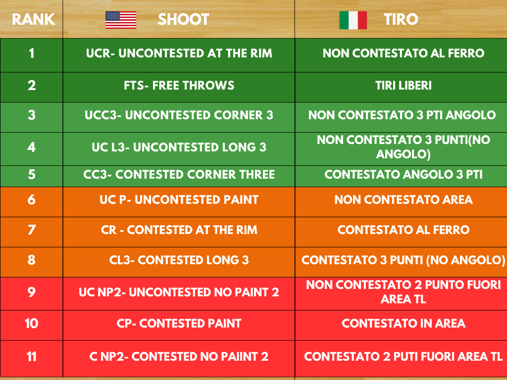 Partiremo dalla terminologia (tradotta anche in italiano), per poi analizzare in ordine decrescente i tiri più efficienti nel basket odierno. È importante, e per me doveroso, citare Michael Arcieri, ex Director of Sport Operations in NBA e attuale General Manager di Pallacanestro Trieste. Quando, nel 2023, arrivò a Trieste portando con sé questa filosofia di gioco, ne rimasi affascinato. Grazie alla fiducia e all’apertura del club verso questa visione, i risultati non si sono fatti attendere, merito anche di un approccio fondato su data analytics e metriche analitiche, applicate con coscienza e costanza.